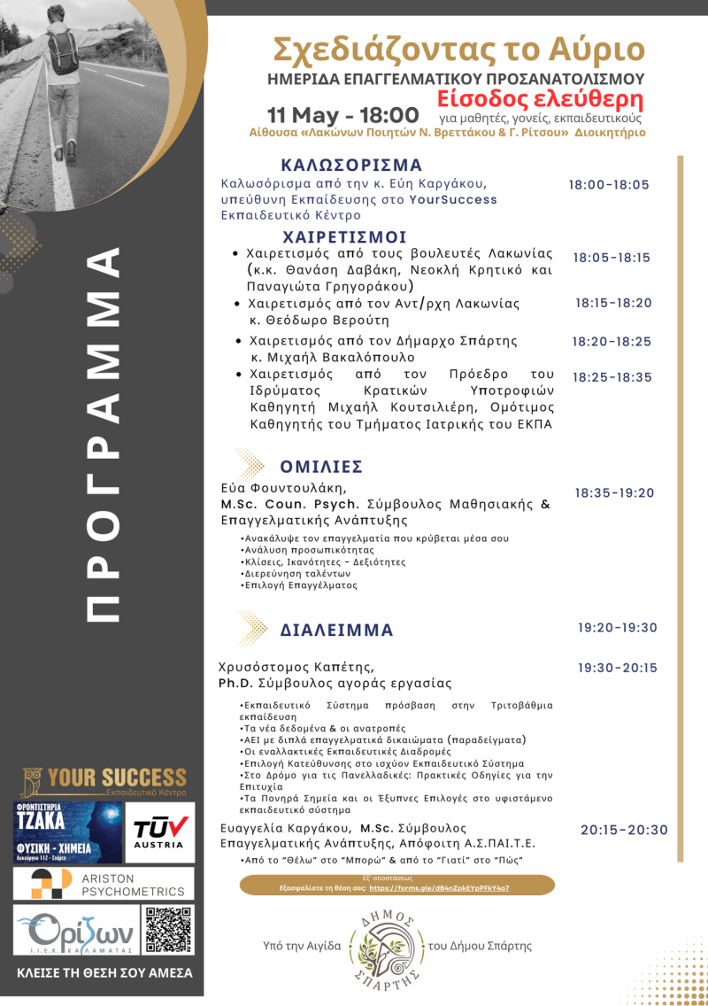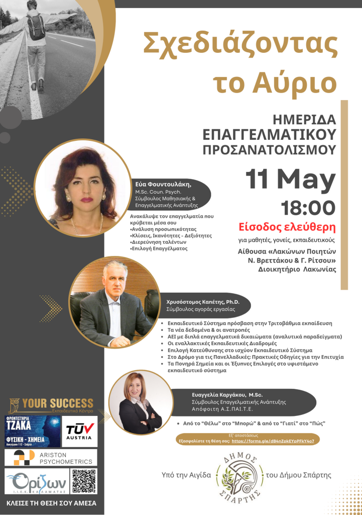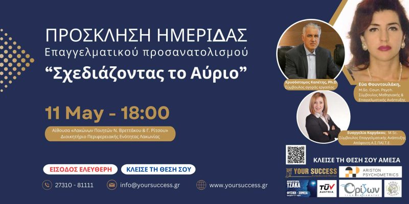 Σας προσκαλούμε με χαρά στην ημερίδα επαγγελματικού προσανατολισμού που διοργανώνουμε με τίτλο «Σχεδιάζοντας το αύριο».