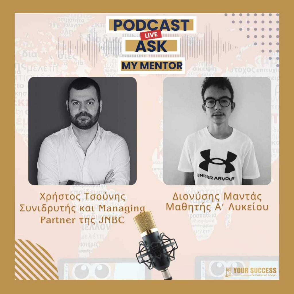 Το podcast “Ask My Mentor “ είναι ο δικός μας τρόπος να μοιραστούμε έμπνευση και γνώση από τις ιστορίες επιτυχίας των μεντόρων που καθοδήγησαν μαθητές μας στην κατάκτηση των στόχων τους. Μέσα από σύντομες αλλά ουσιαστικές συζητήσεις, εξερευνούμε το πώς η καθοδήγηση μπορεί να γίνει ο θεμέλιος λίθος για τη δημιουργία ενός επιτυχημένου μέλλοντος. Εδώ, θα μοιραζόμαστε πολύτιμες εμπειρίες και πρακτικές στρατηγικές, ενθαρρύνοντας την αυτοπεποίθηση και τη σωστή λήψη αποφάσεων. Μείνετε συντονισμένοι για να ανακαλύψετε τι σημαίνει επιτυχία μέσα από τα μάτια εκείνων που την έζησαν!